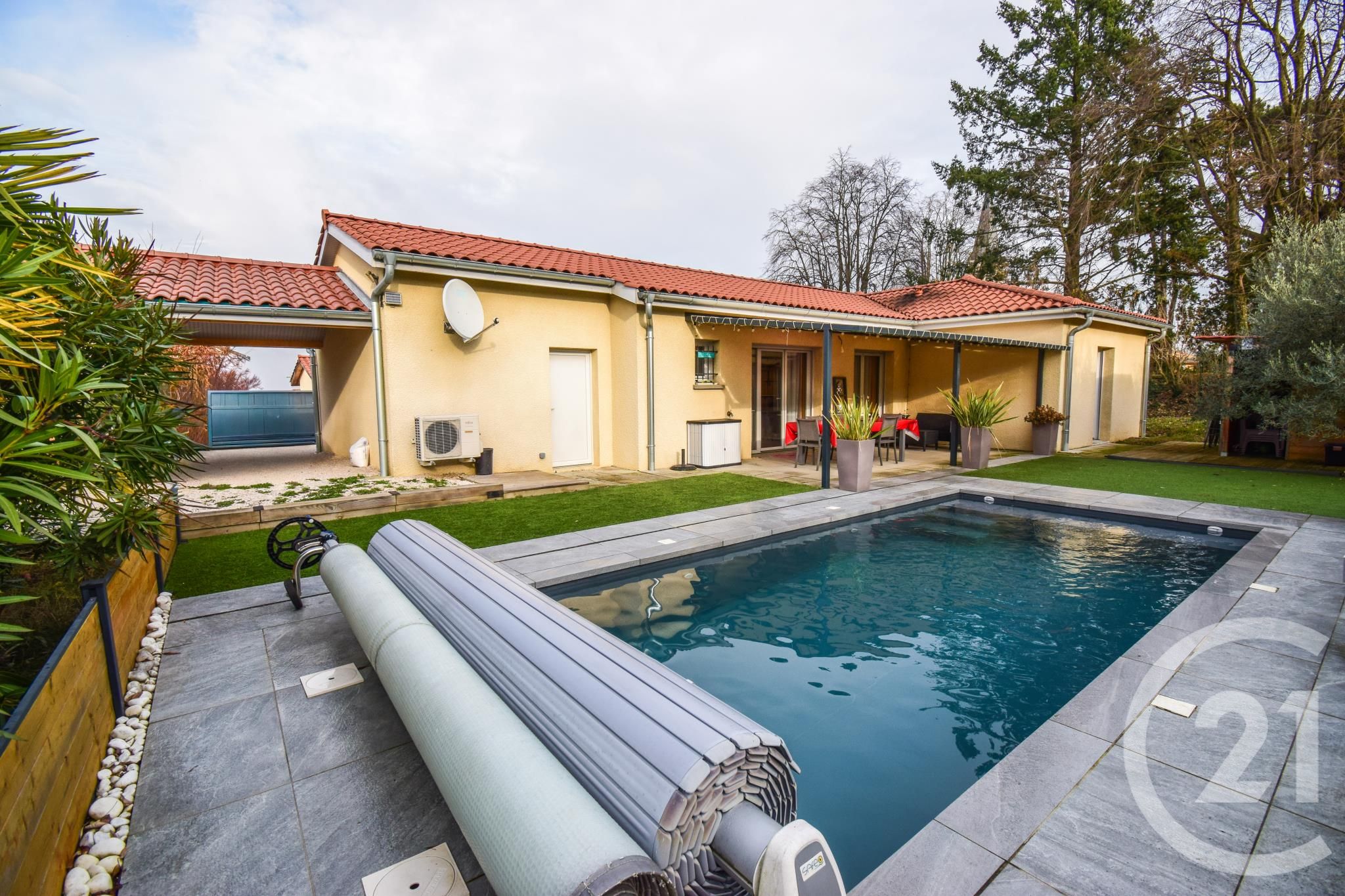 Parlons maintenant de l'extérieur, ou la parcelle de 650m² vous permettra de profiter d'une terrasse couverte, d'une piscine ainsi que d'un bar pour des apéros chaleureux entre amis ou en famille.